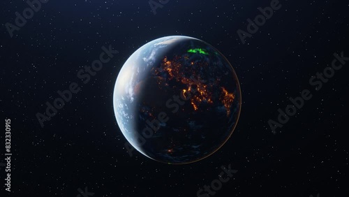 The watermark will not be included on Sticker.: 3d rendering of earth from space with half in darkness showing city lights and faint aurora