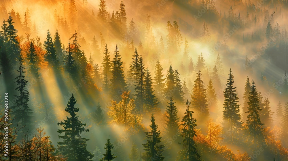 Sticker a beautiful forest with trees in the foreground and background. the sun is shining through the trees - Stickers Sticker a beautiful forest with trees in the foreground and background. the sun is shining through the trees - Stickers