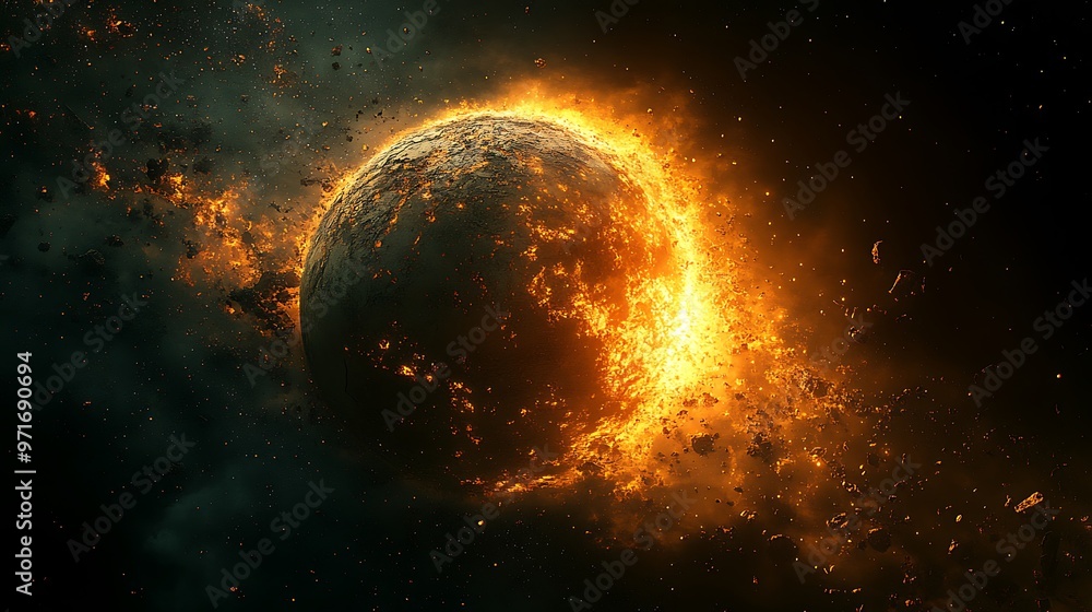 The watermark will not be included on Sticker.: A burning planet explodes in space, engulfed in flames and debris -