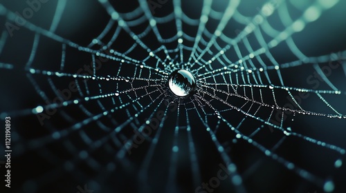 The watermark will not be included on Sticker.: A close-up of a spiderweb covered in water droplets -