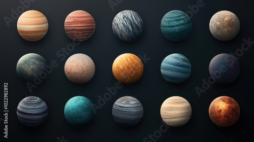 Sticker a collection of 15 different planets, each with unique colors and surface textures, arranged in a fi