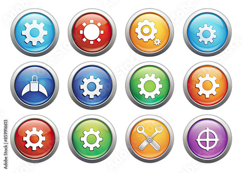 Sticker : A collection of twelve colorful circular icons featuring settings symbols, isolated on a white backg