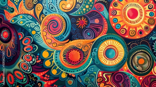 Sticker : A colorful abstract pattern with swirls, dots, and circles -