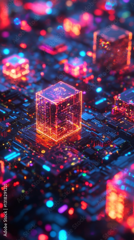 The watermark will not be included on Sticker.: A colorful image of a cityscape with many glowing cubes - the image has a futuristic and vibrant mood