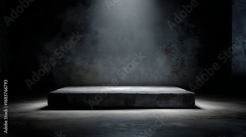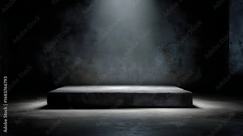 A concrete display platform stands illuminated by a single spotlight in a dark minimalist and texturSticker