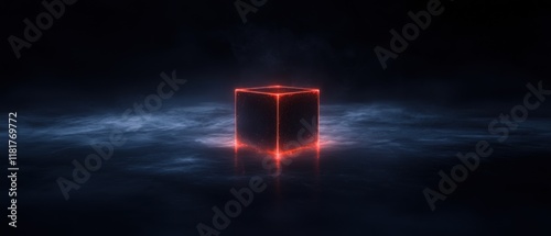 The watermark will not be included on Sticker.: A cube is lit up in red and is surrounded by a dark blue background