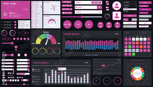 The watermark will not be included on Sticker.: A dark set of interface elements for web and mobile applications with modern icons, buttons, and gra