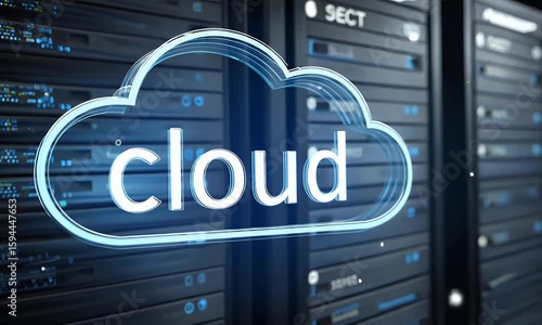 Sticker : A digital artwork depicting cloud computing technology with glowing clouds and devices connected to