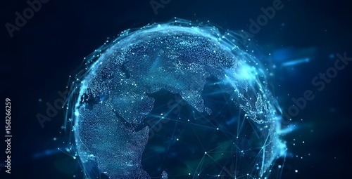 The watermark will not be included on Sticker.: A digital globe with blue light and network connections, representing global connectivity and data t