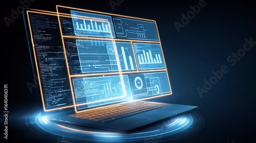The watermark will not be included on Sticker.: A digital illustration of an open laptop with code and data visualizations floating above, set again