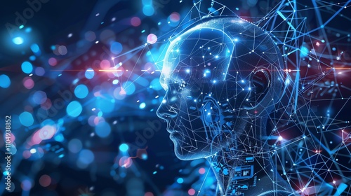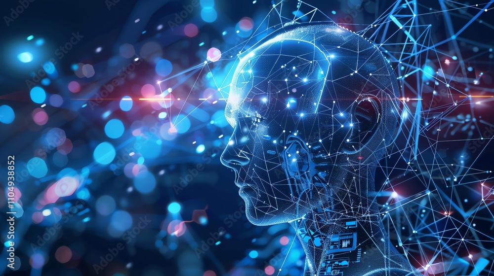 The watermark will not be included on Sticker.: A digital rendering of a human head made up of glowing lines and points, in front of a blue backgrou