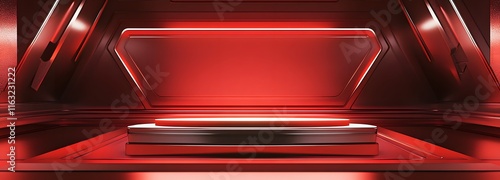 The watermark will not be included on Sticker.: A futuristic metallic podium with sharp edges and an empty space, set against a rich red background -