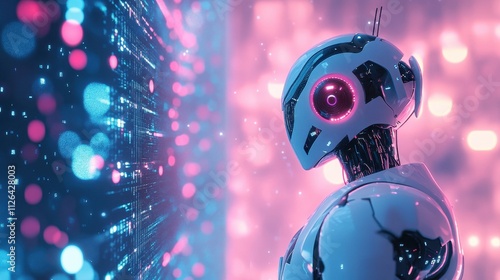 The watermark will not be included on Sticker.: A futuristic robot standing in the middle looking at lines of codes and numbers, neural network inno