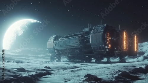 The watermark will not be included on Sticker.: A futuristic spaceship rests on a desolate lunar surface under a bright moon -
