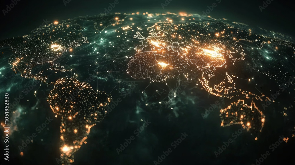 A glowing data matrix connecting tech hubs across the world, representing global innovation and collSticker