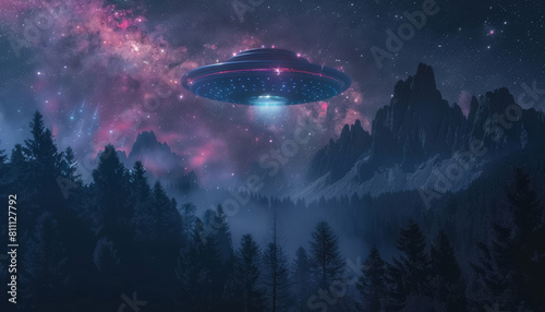 The watermark will not be included on Sticker.: A group of alien spaceships are flying through a forest at night by ai generated image