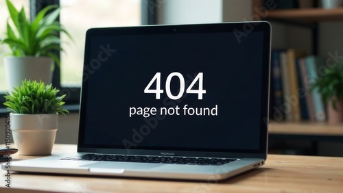 Sticker a laptop on a wooden desk shows a 404 page not found error. the background features a window with na