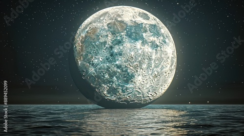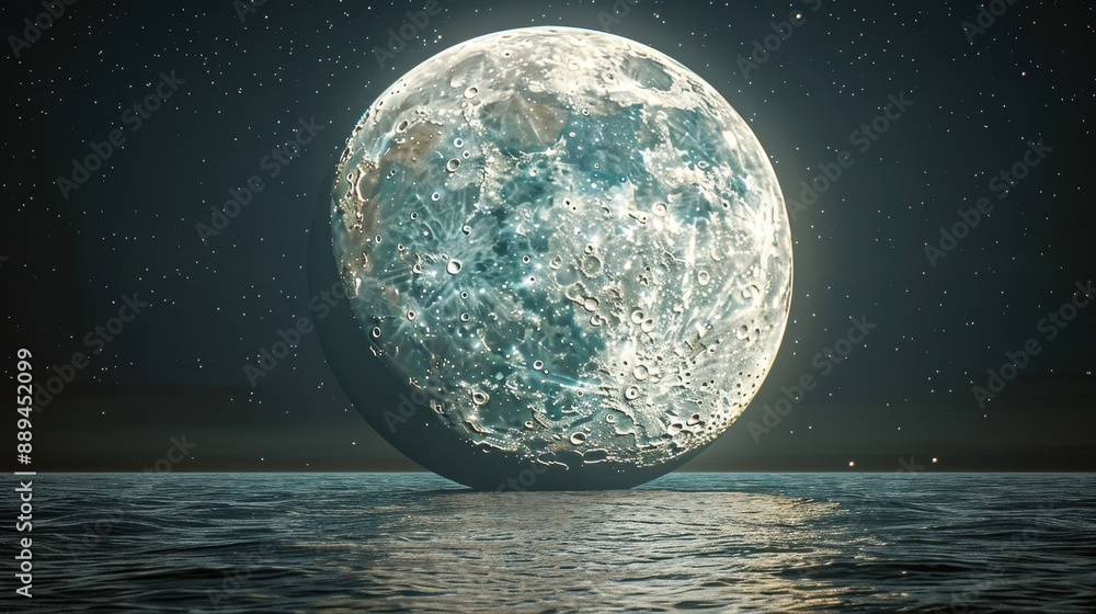The watermark will not be included on Sticker.: A large moon is floating above a calm ocean - the sky is filled with stars, creating a serene and pea