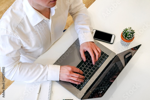 Sticker a male programmer works in front of a laptop screen in a bright office or remotely from home. workpl