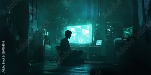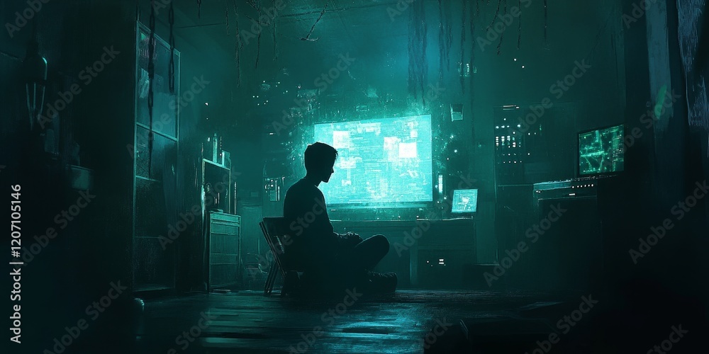The watermark will not be included on Sticker.: A man is sitting in a chair in front of a computer monitor