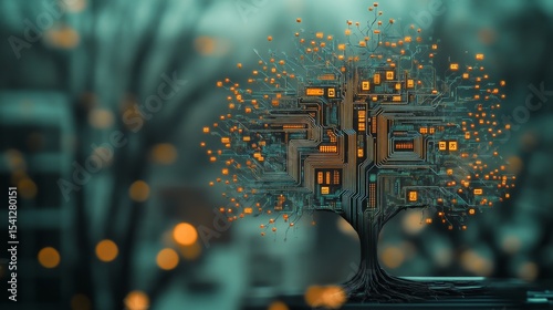 Sticker a mesmerizing blend of nature and technology. this image depicts a tree adorned with glowing circuit