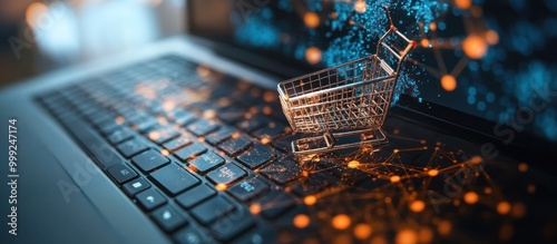 A miniature shopping cart on a laptop keyboard, with a blurred background of a computer screen with Sticker