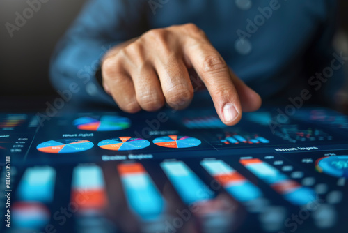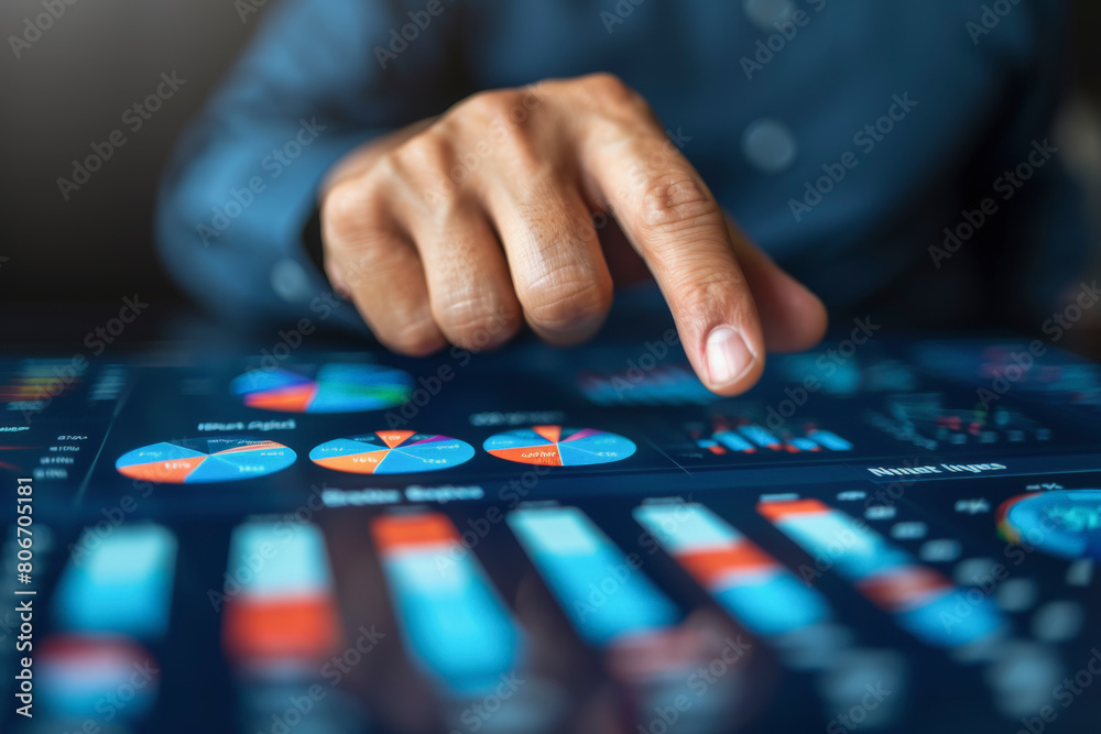 The watermark will not be included on Sticker.: A person in a business suit is interacting with a futuristic touch screen display featuring various