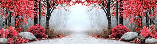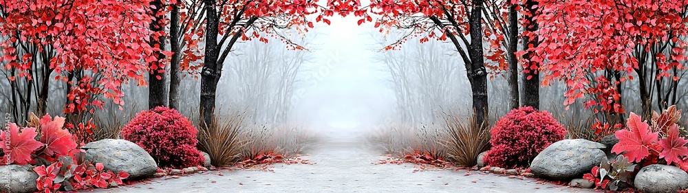 Sticker a serene pathway flanked by vibrant red trees and soft fog, creating a tranquil autumn landscape. ba - Stickers Sticker a serene pathway flanked by vibrant red trees and soft fog, creating a tranquil autumn landscape. ba - Stickers
