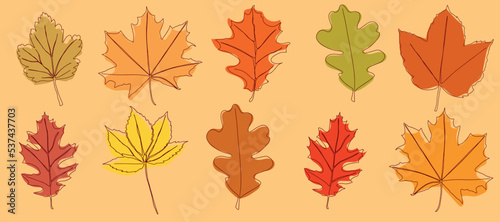The watermark will not be included on Sticker.: A set of autumn leaves drawn in a continuous line - autumn leaf in one line - vector illustration -