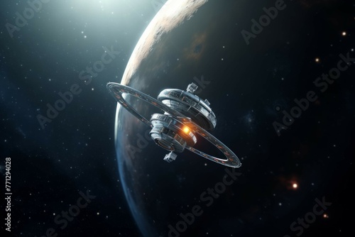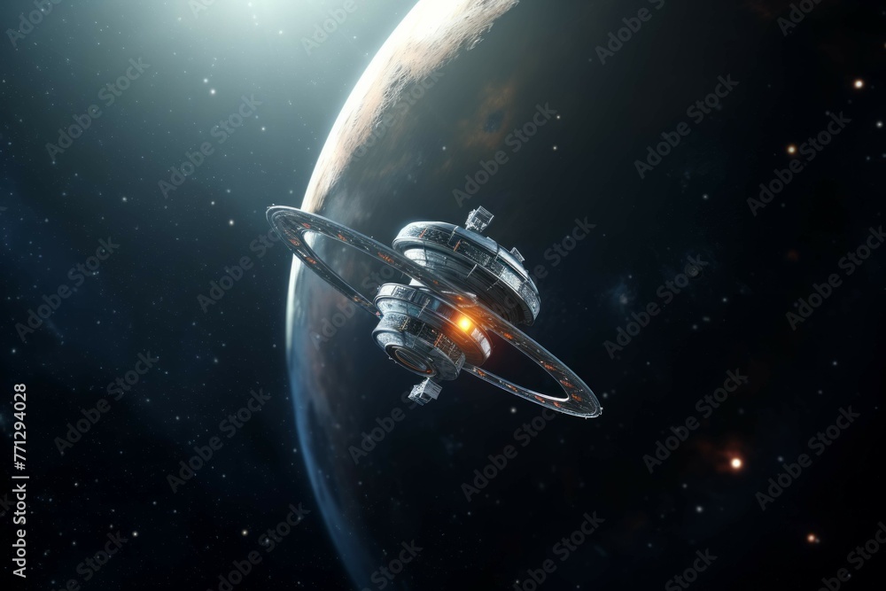 The watermark will not be included on Sticker.: A shot of a space probe exploring a distant planet, with a view of the stars in the background