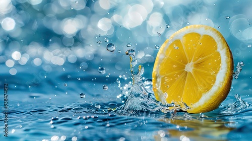 The watermark will not be included on Sticker.: A slice of lemon falls into water with a splash -