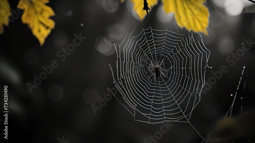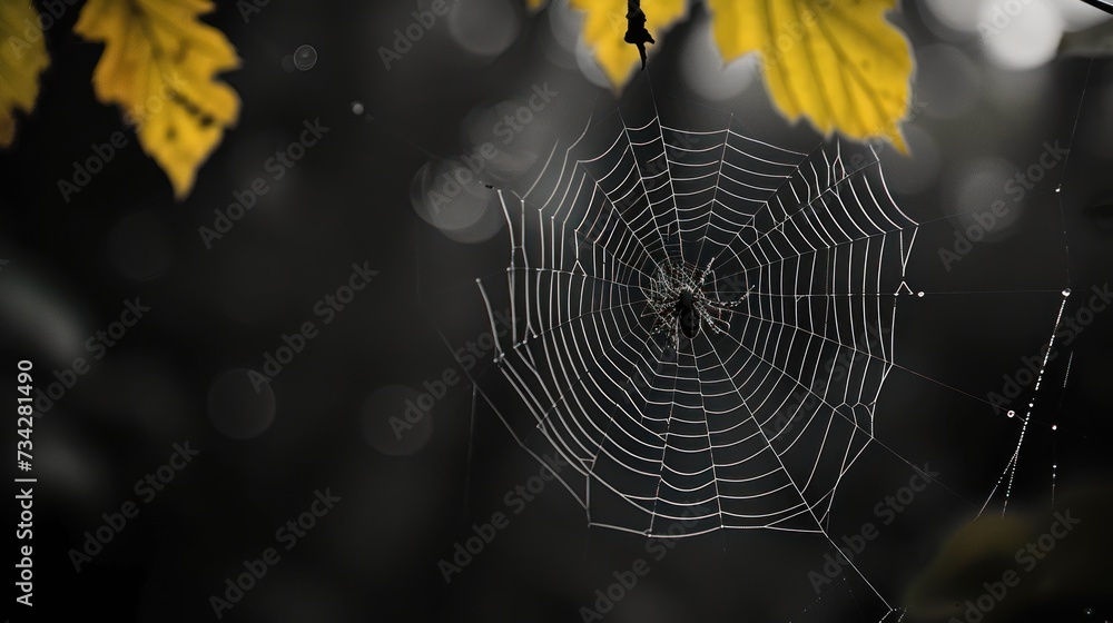 Sticker a spider web in the middle of a tree with yellow leaves on the other side of the spider's web.