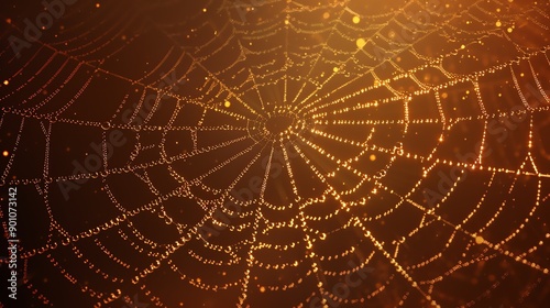 Sticker a spiderweb with dewdrops in a forest with golden light shining through.