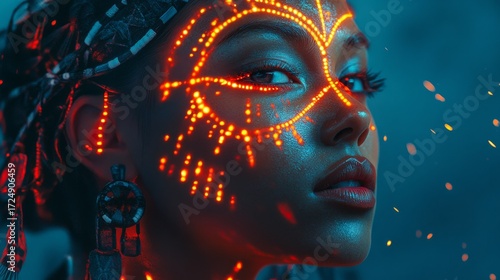 Sticker : A stunning portrait of a person adorned with mesmerizing light patterns - the vibrant colors and crea
