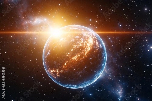 Sticker : A stunning view of a distant planet glowing in the cosmos, illuminated by the light of a distant sta