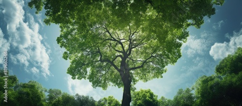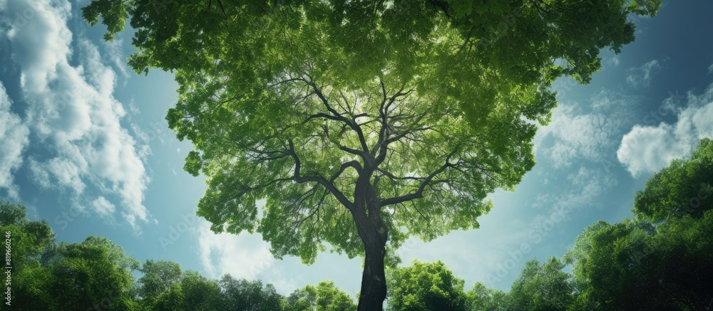 Sticker : A tall green tree as viewed from the ground reaching up towards the sky in a copy space image