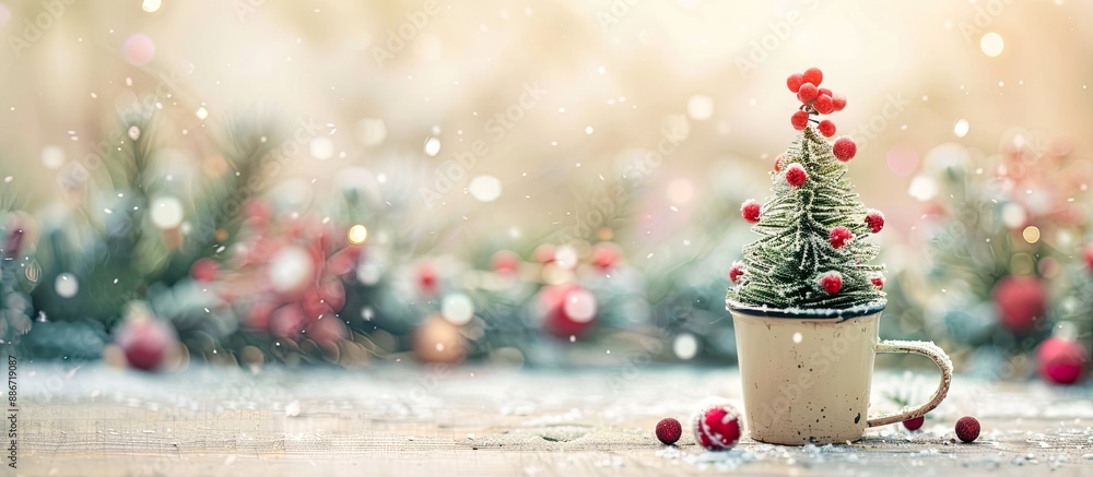 Sticker : A tiny christmas tree placed in a cup with a festive background providing copy space image