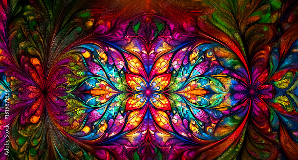 The watermark will not be included on Sticker.: A vibrant and symmetrical abstract pattern with floral elements - intricate design with kaleidoscope