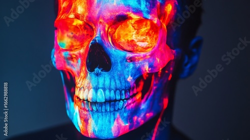 The watermark will not be included on Sticker.: A vibrant depiction of a skull illuminated with colorful lights - this dynamic imagery captures the e