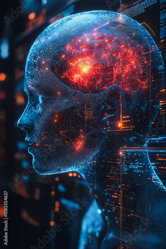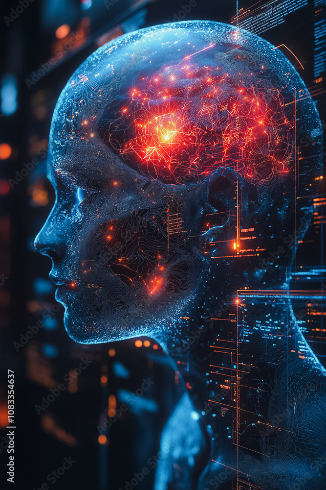 A woman's head is shown in a computer screen with a red glowing brain - concept of technology and artSticker