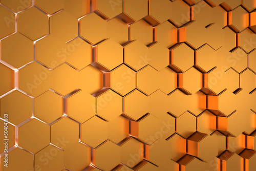 Sticker abstract background of golden hexagon. 3d rendering.