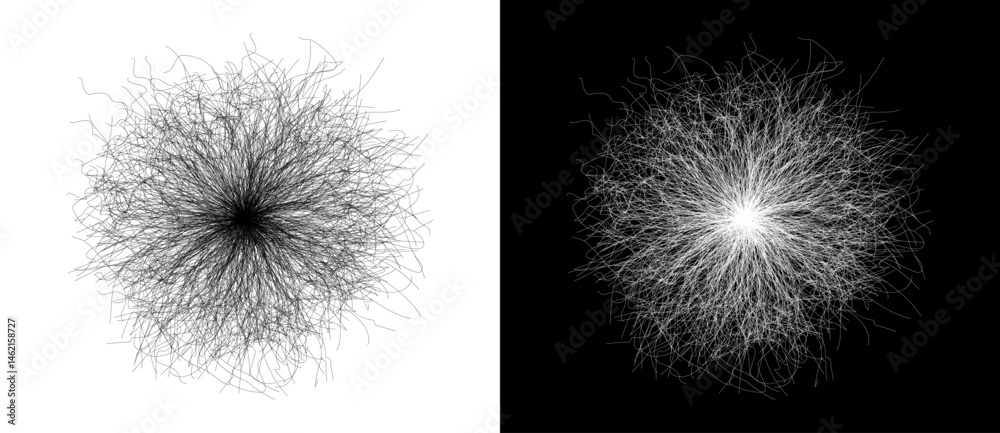The watermark will not be included on Sticker.: Abstract background with lines in chaos like fireworks - a black figure on a white background and the