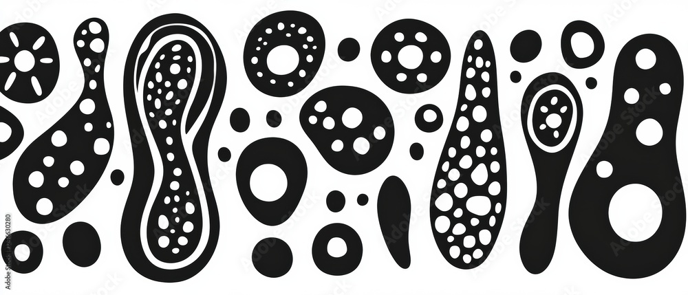Sticker abstract black and white background featuring various cellular shapes and forms for creative design