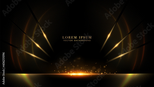 Sticker abstract circle light effect and golden lines with diagonal glowing effects and glitter light on bla