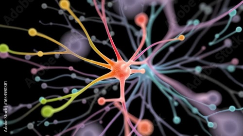 The watermark will not be included on Sticker.: Abstract colorful network structure with radiating lines and nodes on dark background