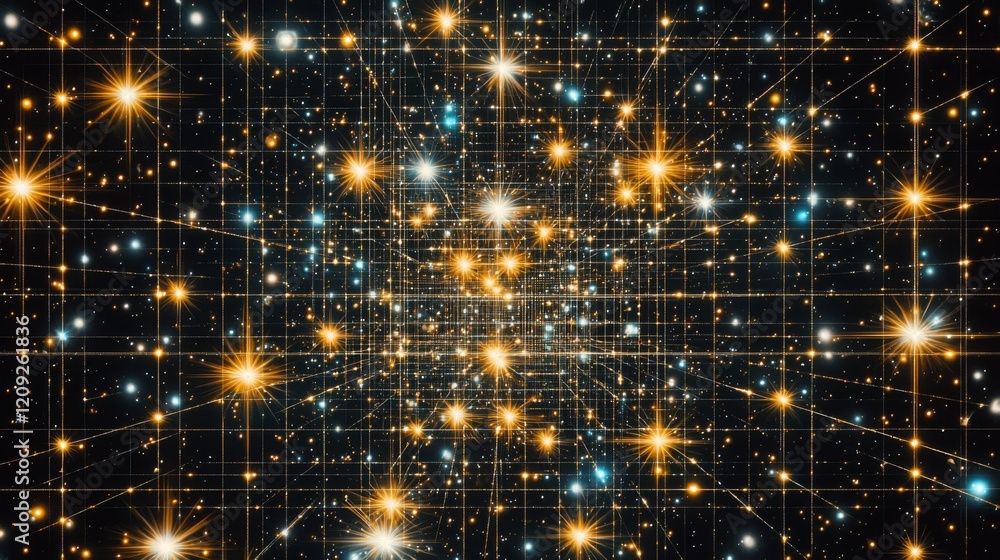 The watermark will not be included on Sticker.: Abstract cosmic grid sparkling stars and interconnected golden lines digital art background
