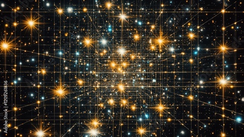 Sticker : Abstract cosmic grid sparkling stars and interconnected golden lines digital art background