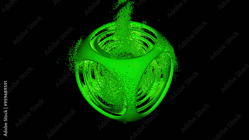 The watermark will not be included on Sticker.: Abstract cube with flying particles inside - design - complex structure on a black background -