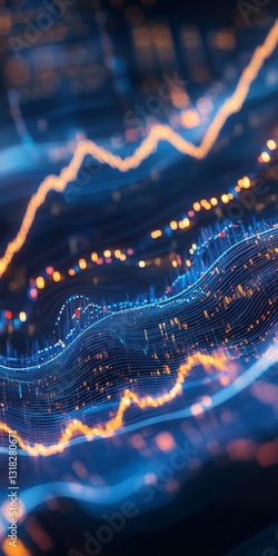 The watermark will not be included on Sticker.: Abstract data visualization with flowing lines and glowing lights representing financial trends