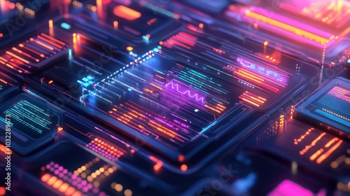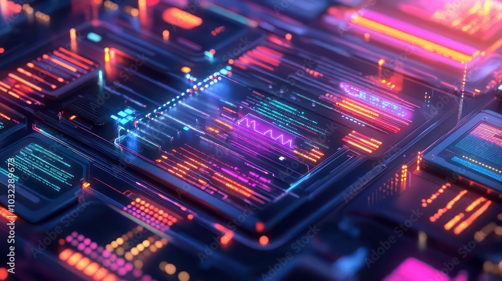 The watermark will not be included on Sticker.: Abstract digital background with glowing lines and geometric shapes -